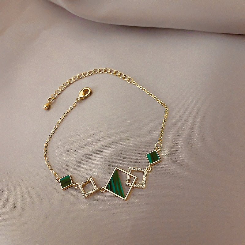 Dieses extravagante Armband überzeugt mit klaren Linien und eleganten Quadrat-Elementen in Weiß oder Grün. Eine stilvolle Kombination aus modernem Look und dezenter Raffinesse – ideal für alle, die ein ausdrucksstarkes Accessoire suchen.